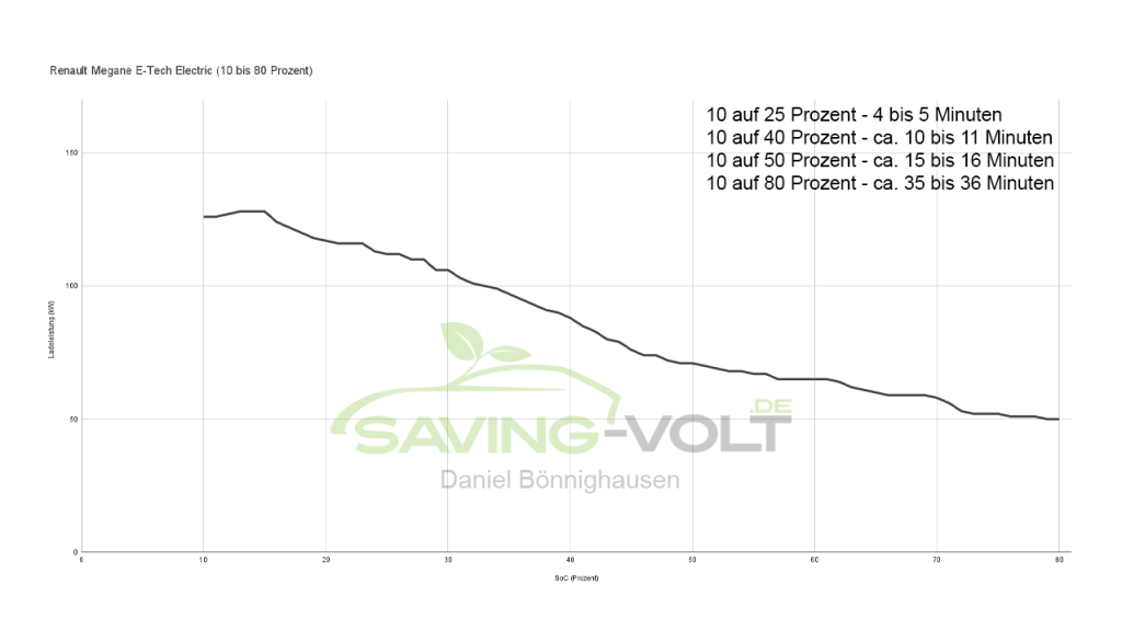 Die Ladeleistung, bzw. der Ladepeak, gibt zwar eine Vorahnung wie schnell ein Auto lädt, für sich alleine ist dieser Wert aber wenig aussagekräftig. Eine viel sinnvollere Angabe ist zum Beispiel wie lange ein Auto von 20 bis 80 Prozent lädt. Beim Megane sind das z.B. laut Renault 30 Minuten. Funktioniert das Laden einwandfrei und hat man seinen Akku vorklimatisiert, (Akkuheizung) dann kommt dieser Wert auch gut hin.